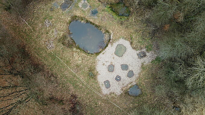 Das Biotop wurde in den Jahren 2009/10 in enger Abstimmung mit der Gemeinde durch die Ortgruppe angelegt. Es besteht aus 15 unterschiedlich großen und tiefen Bodenmulden in Form von Nass- bzw. Feuchtbecken sowie zwei Erdhabitaten als Überwinterungsquartier für Amphibien.